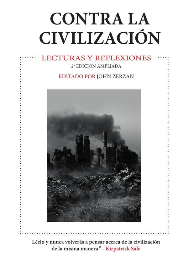 Con los envenenamientos masivos, el calentamiento global y otras noticias de la civilización contemporánea que amenazan al planeta, ¿no deberíamos empezar a reconsiderar nuestro irreflexivo apego a ella?La nueva edición ampliada de Contra la Civilización añade 18 nuevos ensayos a este clásico contemporáneo que ofrece 67 miradas que invitan a la reflexión sobre el núcleo deshumanizado de la civilización moderna, y las ideas que han dado lugar al movimiento anarco-primitivista. El editor de esta convincente antología es John Zerzan, autor de Futuro primitivo y El crepúsculo de las máquinas.”Celebro que la antología de John Zerzan albergue lo mejor de las críticas de la gente civilizada a la civilización. En ella, el lector descubrirá las preguntas que hay que formular y las ideas a tener en cuenta si la humanidad y el mundo natural, tal como lo conocemos, quieren prosperar en el futuro. Este libro es así de importante”.- Chellis Glendinning, autora de Me llamo Chellis y Me estoy recuperando de la civilización occidental.”Es su negativa colectiva a decir ‘Aquí está la civilización: acéptala’ lo que hace que este volumen sea tan importante. Léelo y no volverás a pensar en la civilización de la misma manera”.- Kirkpatrick Sale, autor de Rebeldes contra el futuro”Esta es una extraordinaria colección del pensador anarquista más importante de nuestro tiempo, una potente introducción a, como dice Zerzan con tanta precisión, la patología de la civilización. Zerzan lleva décadas articulando una crítica práctica y teórica de la civilización, y este libro -aunque es una antología editada de ensayos propios y ajenos- lo reúne todo de forma convincente e innegable. Me encantan todos los libros de Zerzan, pero creo que éste es el que más me gusta”.- Derrick Jensen, autor de Un lenguaje más antiguo que las palabras