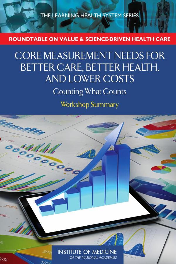 Health care quality and its affordability have become very pressing issues in the United States. All sectors of the country are attempting to push forward initiatives that will improve the health care system as well as the health of the American population in general. Despite the economical dedication to health care, about 1/5, the system remains uneven and fragmented, patient harm is quite common, care is often uncoordinated, and many more mishaps occur. There exists many obstacles to improve the nation’s health care system; these include the capacity to reliably and consistently measure progress. In 2006 the Institute of Medicine (IOM) established the Roundtable on Value & Science-Driven Health Care which has since accelerated the development of a learning health system- one in which science, informatics, incentives, and culture are aligned to create a continuous learning loop. This learning loop would thus help make the health care system better. In response, the IOM organized a 2-day workshop to explore in depth the core measurement needs for population health, health care quality, and health care costs. The workshop hoped to gain a full understanding of how to improve the nation’s measurement capacity to track progress in the health care system. Having this knowledge would help the nation get one step closer to the creation of an efficient learning loop. The workshop was divided into a series of sessions that focused on different aspects of measurement. Core Measurement Needs for Better Care, Better Health, and Lower Costs: Counting What Counts: Workshop Summary includes explanations and key details for these sessions: Vision, Current Measurement Capabilities, Specifying the Shape of a Core Metric Set, and Implementation. The report also features common themes within these areas, the workshop agenda, and information about those involved.