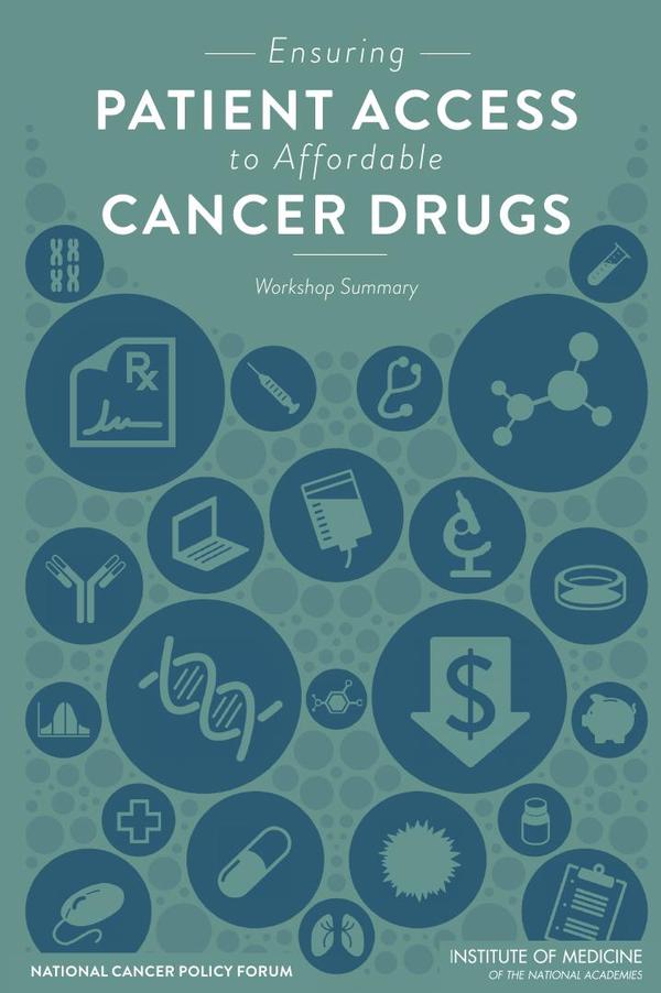 In recent years, patients’ out-of-pocket costs for cancer care have been rising rapidly. These costs include health insurance deductibles, coinsurance, and copayments for covered services, as well as services that are not covered by insurance. Many cancer patients are especially vulnerable financially because their illness and/or treatment impedes their ability to work, with some patients losing employment altogether. Even with insurance, cancer patients often experience financial hardships, such as going into debt, depleting all assets to pay for cancer treatment, and personal bankruptcy. Although many elements contribute to the cost of cancer care, one important component is the cost of new cancer drugs, which has been escalating rapidly in recent years. To explore the issue of cancer drug costs and patient access to affordable, appropriate drug therapies, the Institute of Medicine’s National Cancer Policy Forum convened a workshop on ensuring patient access to affordable cancer drugs in June 2014. Affordability was considered from both individual and societal perspectives. The workshop featured discussion panels as well as invited presentations from clinicians, researchers, representatives from the health insurance and pharmaceutical industries, and patient advocates. Ensuring Patient Access to Affordable Cancer Drugs summarizes the presentation and discussion of the workshop.