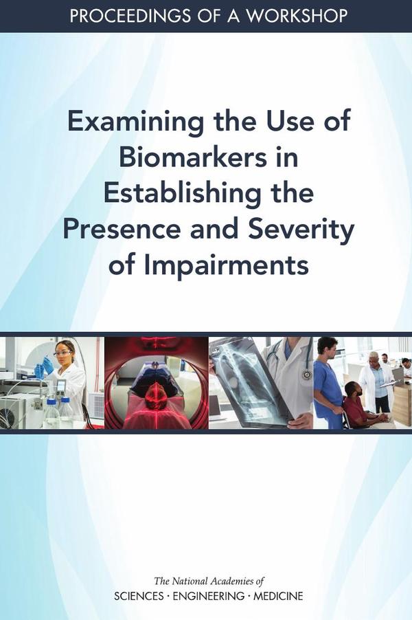 As part of the overall disability determination process, the Social Security Administration uses a step-by-step approach to understand how severe an individual’s condition is and whether it meets program criteria for disability. The use of various types of biomarkers has been suggested as a way to strengthen the amount and quality of objective evidence available to the review process. At the request of the Social Security Administration, the National Academies of Sciences, Engineering, and Medicine’s Board on Health Care Services organized a virtual workshop on July 21, 2020, titled The State of the Science of the Use of Biomarkers to Establish the Presence and Severity of Impairments. Workshop discussions focused on the current and potential uses for biomarkers; explored legal and ethical implications associated with biomarker use in clinical decision making; and considered the possible uses of nongenetic biomarkers as tools for the diagnosis or prognosis of the severity of specific physical and mental impairments. This publication summarizes the presentations and discussion of the workshop.