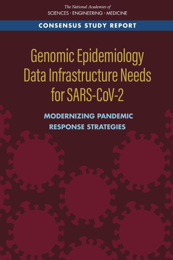 In December 2019, new cases of severe pneumonia were first detected in Wuhan, China, and the cause was determined to be a novel beta coronavirus related to the severe acute respiratory syndrome (SARS) coronavirus that emerged from a bat reservoir in 2002. Within six months, this new virus—SARS coronavirus 2 (SARS-CoV-2)—has spread worldwide, infecting at least 10 million people with an estimated 500,000 deaths. COVID-19, the disease caused by SARS-CoV-2, was declared a public health emergency of international concern on January 30, 2020 by the World Health Organization (WHO) and a pandemic on March 11, 2020. To date, there is no approved effective treatment or vaccine for COVID-19, and it continues to spread in many countries.Genomic Epidemiology Data Infrastructure Needs for SARS-CoV-2: Modernizing Pandemic Response Strategies lays out a framework to define and describe the data needs for a system to track and correlate viral genome sequences with clinical and epidemiological data. Such a system would help ensure the integration of data on viral evolution with detection, diagnostic, and countermeasure efforts. This report also explores data collection mechanisms to ensure a representative global sample set of all relevant extant sequences and considers challenges and opportunities for coordination across existing domestic, global, and regional data sources.