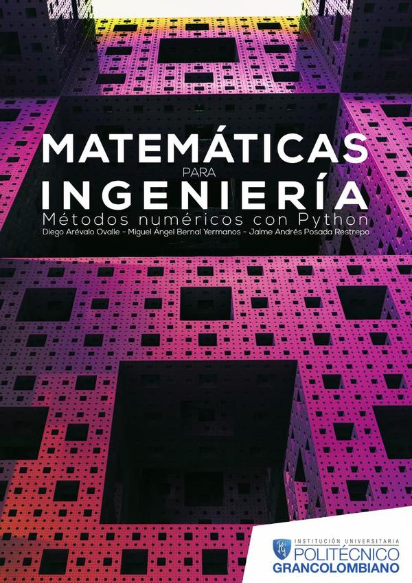 Este texto es el resultado de nuestra labor como orientadores del curso de método numéricos de la Institución Universitaria Politécnico Grancolombiano durante varios años. Aunque inicialmente solamente se disponía de notas de clase construidas de manera informal para los cursos, con el tiempo surgió la necesidad de consolidarlas en un solo documento. El libro contiene métodos computacionales para resolver problema esencial en el campo de ingeniería o matemática aplicada. En cada método se pretende dar al lector una visión de su esencia, necesidad, ventajas y desventajas. En algunos casos, alejándose de presentaciones rigurosas, pero sin dejar de ser correctas. El objetivo final es proporcionar los elementos necesarios para la aplicación adecuada de los algoritmos. El capítulo 1 expone los principales procedimientos computacionales para la solución de ecuaciones de una variable, describiendo sus ventajas y desventajas computacionales. El capítulo 2 presenta las herramientas básicas para la estimación de nuevos datos a partir de un conjunto de puntos. Se abordan dos enfoques de interpolación: exacta y ajuste de mínimos cuadrados. El capítulo 3 Comprende los algoritmos de factorización LU. Jacobi y Guass-Seidel para la solución de sistemas de ecuaciones lineales. El capítulo 4 se encuentra dedicado a los métodos numéricos para la solución de ecuaciones diferenciales, indicando con el método de Euler y finalizando con el método RK4. Para terminar, deseamos expresar nuestros agradecimientos a los alumnos y compañeros que a través de su inquietud, permitieron la construcción der los contenidos de este documento.
