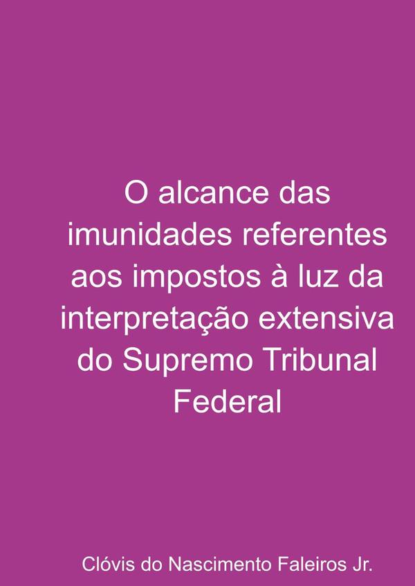 Neste livro será analisado o alcance das imunidades referentes aos impostos à luz da interpretação extensiva adotada pelo Supremo Tribunal Federal. A Constituição Federal não dispõe expressamente sobre a forma como as imunidades devem ser interpretadas, como o faz em relação às isenções. Desse modo, assumindo a tarefa de intérprete da Constituição, o Supremo vem interpretando tais imunidades de forma ampla a fim de atender o exato alcance buscado pelo legislador constituinte. O livro traz inúmeros julgados e súmulas do Supremo com o intuito de ilustrar a tendência jurisprudencial ampliativa adotada em relação às imunidades.