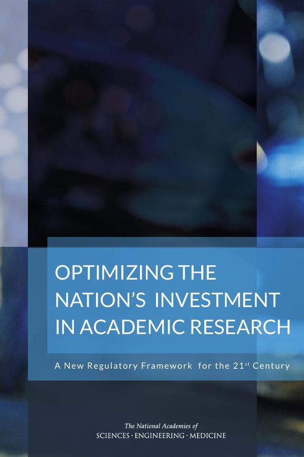 Research universities are critical contributors to our national research enterprise. They are the principal source of a world-class labor force and fundamental discoveries that enhance our lives and the lives of others around the world. These institutions help to create an educated citizenry capable of making informed and crucial choices as participants in a democratic society. However many are concerned that the unintended cumulative effect of federal regulations undercuts the productivity of the research enterprise and diminishes the return on the federal investment in research. Optimizing the Nation’s Investment in Academic Research reviews the regulatory framework as it currently exists, considers specific regulations that have placed undue and often unanticipated burdens on the research enterprise, and reassesses the process by which these regulations are created, reviewed, and retired. This review is critical to strengthen the partnership between the federal government and research institutions, to maximize the creation of new knowledge and products, to provide for the effective training and education of the next generation of scholars and workers, and to optimize the return on the federal investment in research for the benefit of the American people.