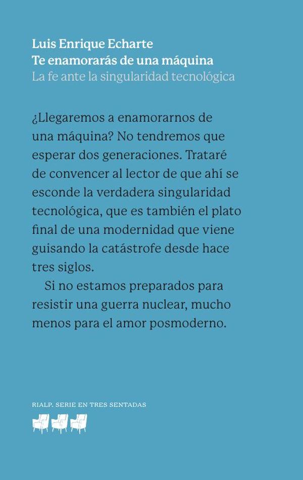 Este revelador ensayo de bioética analiza cómo los avances tecnológicos están afectando a los fundamentos de la cultura occidental. Echarte lanza una advertencia provocadora: enamorarse de una IA es “un peligro más letal y menos manifiesto que una explosión nuclear”.El autor invita a avanzar hacia un “verdadero humanismo tecnológico” y a “aprender de nuevo a temblar” ante los horizontes tecnológicos y el “amor máquina”, que identifica como el principal peligro de la posmodernidad.