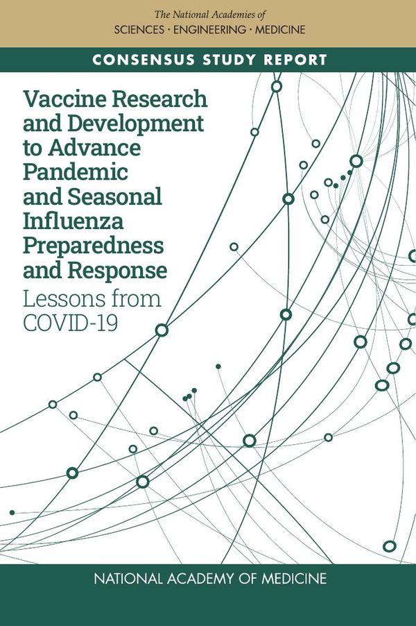 The global response to COVID-19 has demonstrated the importance of vigilance and preparedness for infectious diseases, particularly influenza. There is a need for more effective influenza vaccines and modern manufacturing technologies that are adaptable and scalable to meet demand during a pandemic. The rapid development of COVID-19 vaccines has demonstrated what is possible with extensive data sharing, researchers who have the necessary resources and novel technologies to conduct and apply their research, rolling review by regulators, and public-private partnerships. As demonstrated throughout the response to COVID-19, the process of research and development of novel vaccines can be significantly optimized when stakeholders are provided with the resources and technologies needed to support their response.Vaccine Research and Development to Advance Pandemic and Seasonal Influenza Preparedness and Response focuses on how to leverage the knowledge gained from the COVID-19 pandemic to optimize vaccine research and development (R&D) to support the prevention and control of seasonal and pandemic influenza. The committee’s findings address four dimensions of vaccine R&D: (1) basic and translational science, (2) clinical science, (3) manufacturing science, and (4) regulatory science.