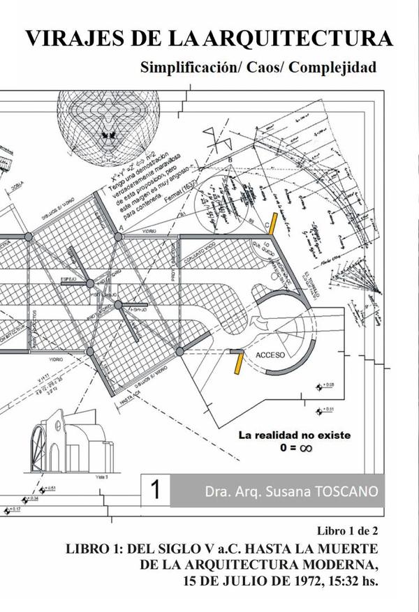 La obra “Virajes de la Arquitectura: Simplificación/Caos/Complejidad”, se compone de dos libros, proponiendo una mirada holística de la arquitectura, tomando en cuenta la relación entre la cosmovisión de cada momento histórico y su incidencia en la gestación y concreción en la arquitectura. El presente, “Libro 1: Desde el S. V a.C hasta la muerte de la Arquitectura Moderna. 15 de julio de 1972 – 15:32 hs”; describe el nacimiento, apogeo y caída de las seguridades establecidas por una ciencia que todo lo ve y todo lo sabe correspondiente al paradigma de la simplificación, según palabras de Edgar Morin.A lo largo de las páginas se muestra cómo y porqué, la matemática, de ser emblema de verdad, armonía y belleza para los griegos, pasó a ser soberana en el reino de la razón y, asentándose en ella, por 25 siglos se fue construyendo la estructura científica necesaria para brindar las seguridades protectoras ante un inconmensurable e impenetrable universo; al igual que niños aferrados a las seguridades de los mandatos paternos, la ciencia se aferró a un único modelo matemático. Para los niños, la casa familiar es símbolo de seguridad, para la ciencia tradicional, la seguridad fue otorgada por la geometría euclidiana, el álgebra tradicional y la lógica newtoniana; para seguir cediéndola, debió resignificar conceptualizaciones y símbolos a lo largo del tiempo para poder ajustarlos a los momentos históricos vigentes. Al correr de los siglos, la ciencia comienza a replantearse que su casa, el universo, no estaba ordenado como creía. Se había escondido mucho bajo la alfombra y en los rincones; cosas como el tiempo, el movimiento y el sujeto mismo. El siglo XX constituyó el ataque constante de los esquemas y valores establecidos; Nietzsche mata a Dios, Heisenberg y Bohr, demuestran que no existen las mediciones absolutas, solo posibilidadesy todas válidas; como broche de oro, Gödel demostrará la incompletitud del sistema matemático vigente y 1969, mediante el teorema de Kantor – Berstein se demuestra, que en el pequeño intervalo de la recta real, que va del número 0 al número 1, existe la misma cantidad de puntos que en toda la recta real, que va de menos infinito a más infinito. La arquitectura se hizo cargo de ello y en 1972, mediante la implosión del complejo habitacional que había constituido el emblema de la arquitectura moderna, decreta la muerte de ésta, transitando el duelo de la mano del posmodernismo. Es hasta aquí donde llega el Libro I. En el “Libro 2: Desde el Deconstructivismo hasta la informática cibernética, pasando por la inteligencia artificial”, se continúa el recorrido hasta nuestros días.